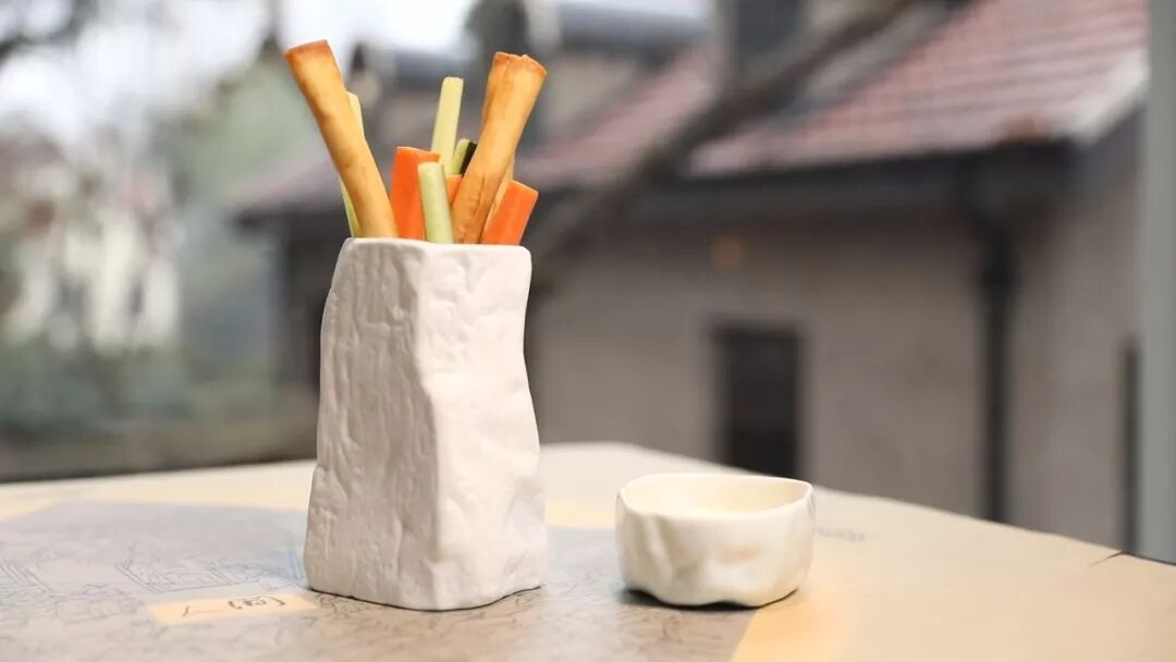 桌上造型奇特,笔筒形状的容器里面是新鲜的黄瓜、胡萝卜等蔬菜配上油炸猪柳,蘸以酸甜的色拉酱食用,味道清甜爽口。
