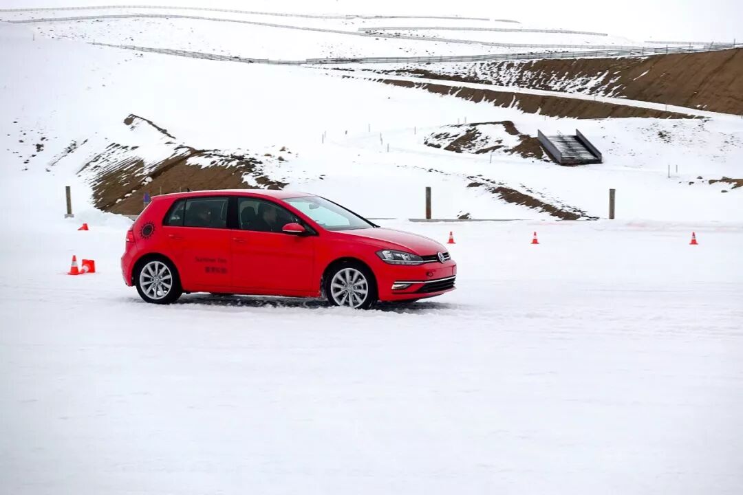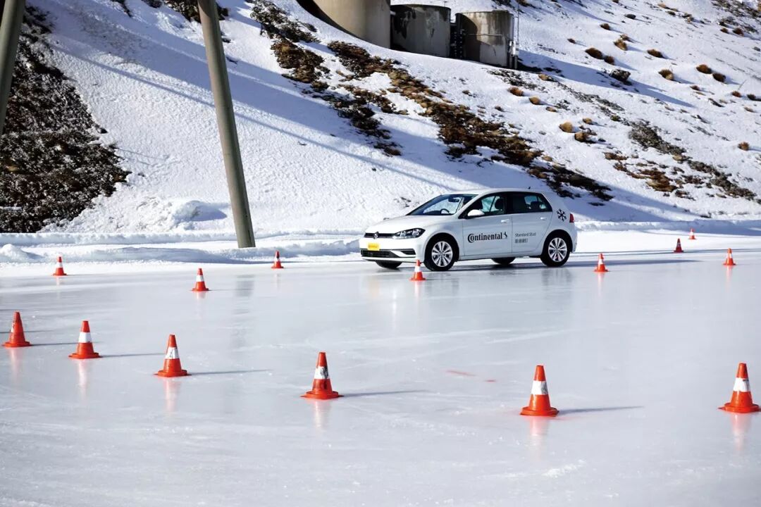 阵仗看似不小,其实我要做的仅是开车在雪地上完成几次绕桩而已。实际操作,就是挂上D挡按连续的“S”形前进。尽己所能,越快越好。过程虽简单,但装在同型号车上的三款同尺寸轮胎,它们之间的差异在百米内已经立见分晓。皑皑白雪之上,夏季轮胎自然是最容易打滑的一个——即便有动态稳定系统全程守护,要想流畅地在桩桶间穿梭,车速就不能比我自己在雪地上跑着快出多少,而且稍有大意就无法让车子按所想的路线前进。全季节轮胎表现略好,但最终在抓地力上胜出的还是冬季轮胎。很明显,如果在转弯之前快速收油,冬季轮胎能让前轮更好地扒在雪地上。这意味着无论你是一位经验丰富的驾车老手,还是一名驾校刚毕业的新司机,都能在雪地上更好地控制车辆——前者自能想办法找到刺激的驾车乐趣,后者将在ESP的辅助下获得更安全的雪地行车体验。