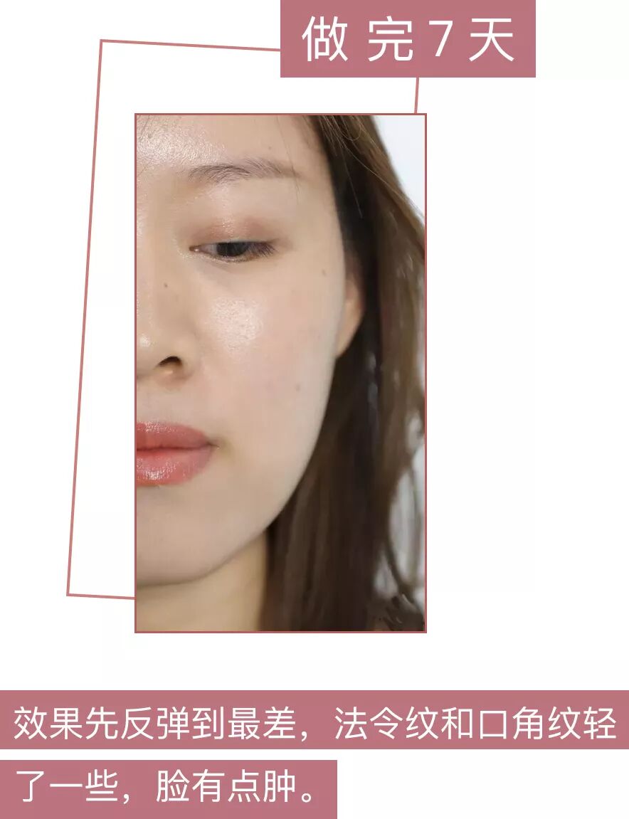 做完以后7天,法令纹和口角纹都能明显感觉变淡了,但是整个脸因为治疗的原因呈现一种水肿的状态,医生说治疗完一周的时候效果最差,但我自己看着觉得还可以。