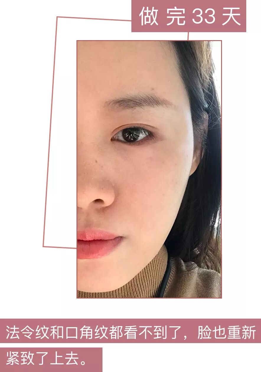 治疗完第33天,也就是今天拍的照片,能清楚的看到,之前的法令纹和口角纹不见了,脸也小了下来,皮肤呈现一种向上走的趋势,这些图都没有p过,还能看到我的粉底不够均匀哈哈哈