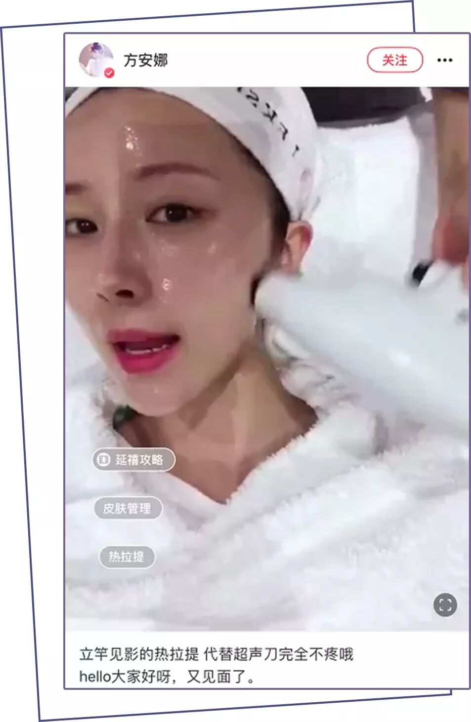 演员方安娜就公开晒过自己做热拉提的经历,但治疗时用的却是深蓝射频的治疗头,也就是说,她其实做的不是热拉提,而是深蓝射频。