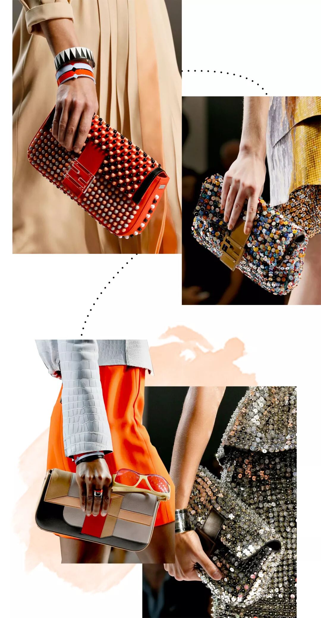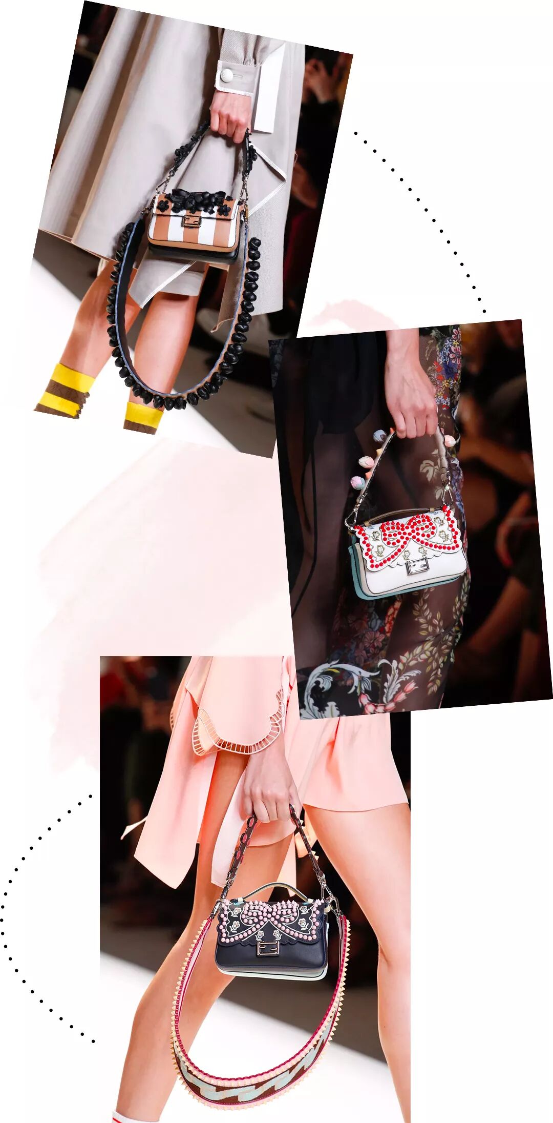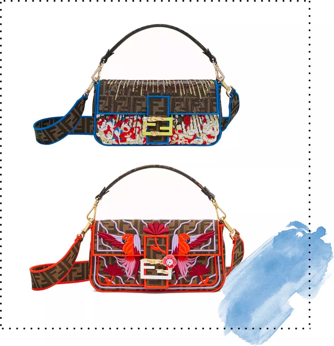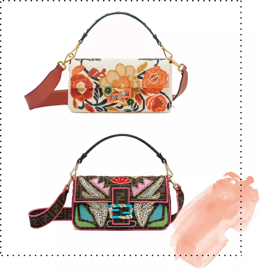 17年春夏的法棍包上多了很多花朵、铆钉这些立体装饰,搭配流行的粗肩带,FENDI作为罗马老牌时装屋的工艺真的没话说。