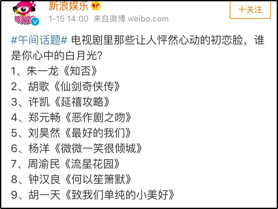 最近,微博就发起了“电视剧里那些让人怦然心动的初恋脸,谁是你心中的白月光男主”热门话题,网友们也随即展开了激烈角逐