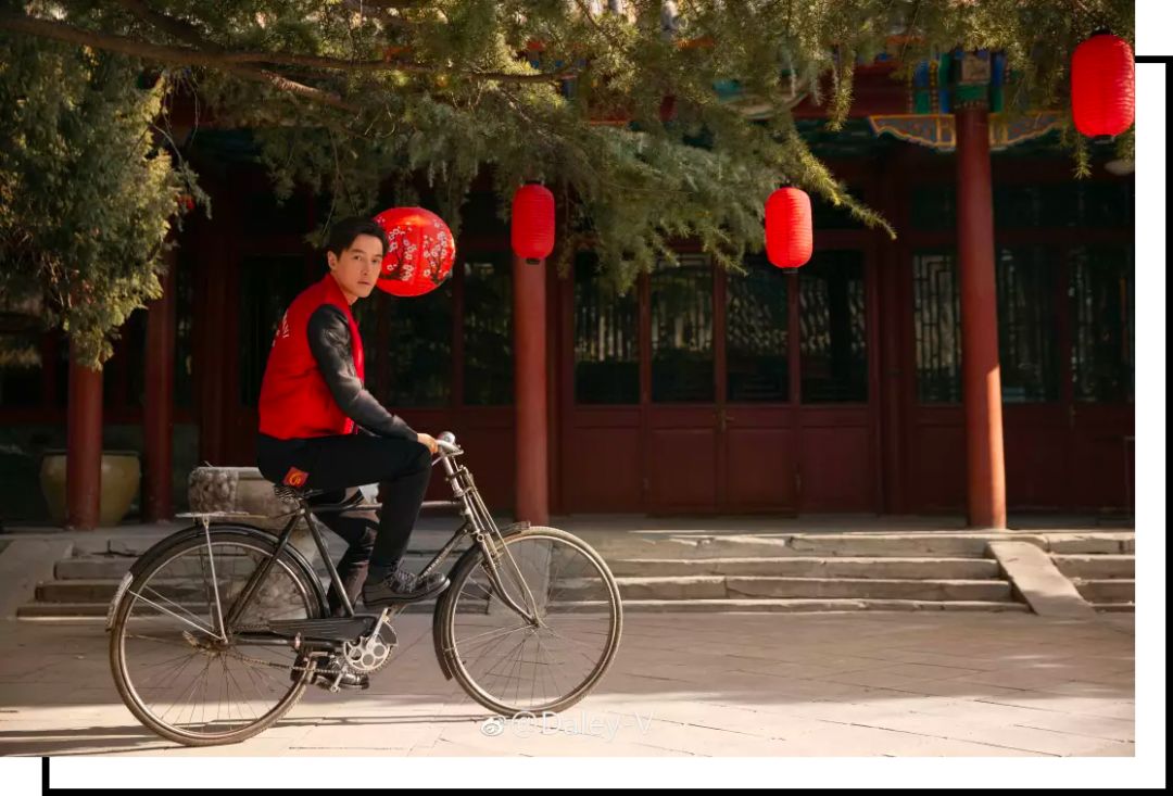 喜气洋洋的中国红,传统与时尚在这一刻互相碰撞,擦出了时尚的火花!画报里骑着老式自行车的胡歌似乎也在表达着“快过年了,把春意带回家”的意思呢