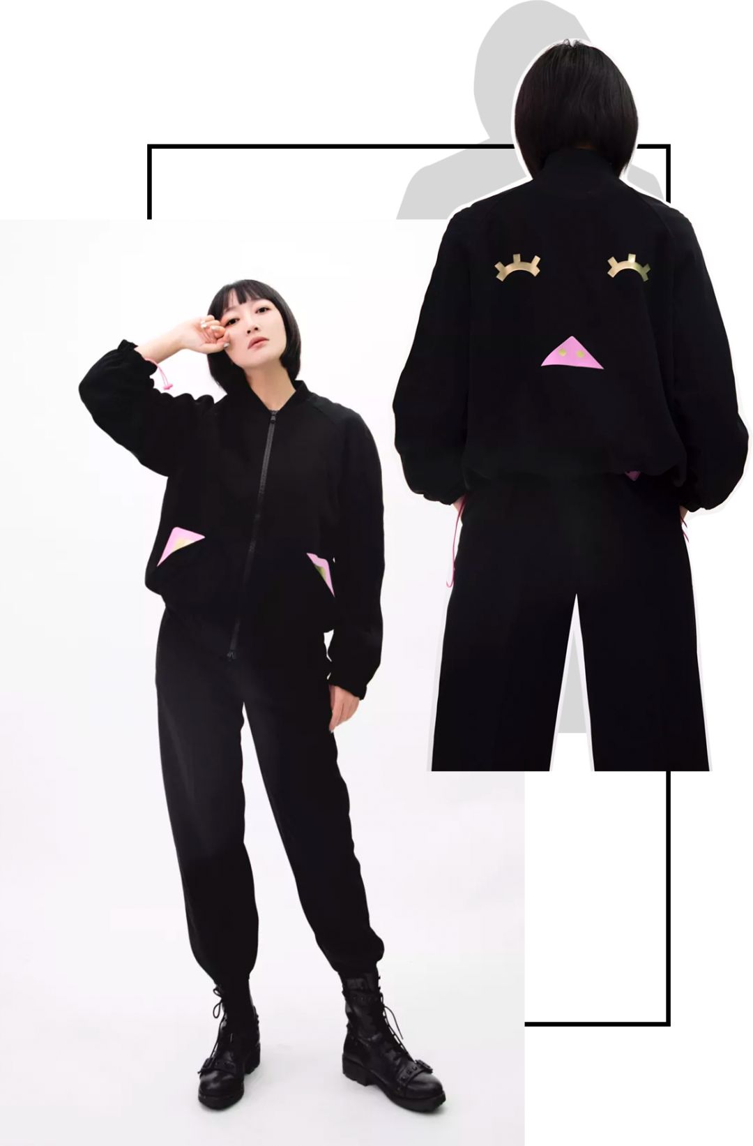 我入手了这套黑色尼龙夹克and今年很火的工装运动裤,穿起来非常摩登帅气!单品点缀了闪光粉、金色元素,猪猪图案也以诙谐的几何图形展现出来,既个性又可爱