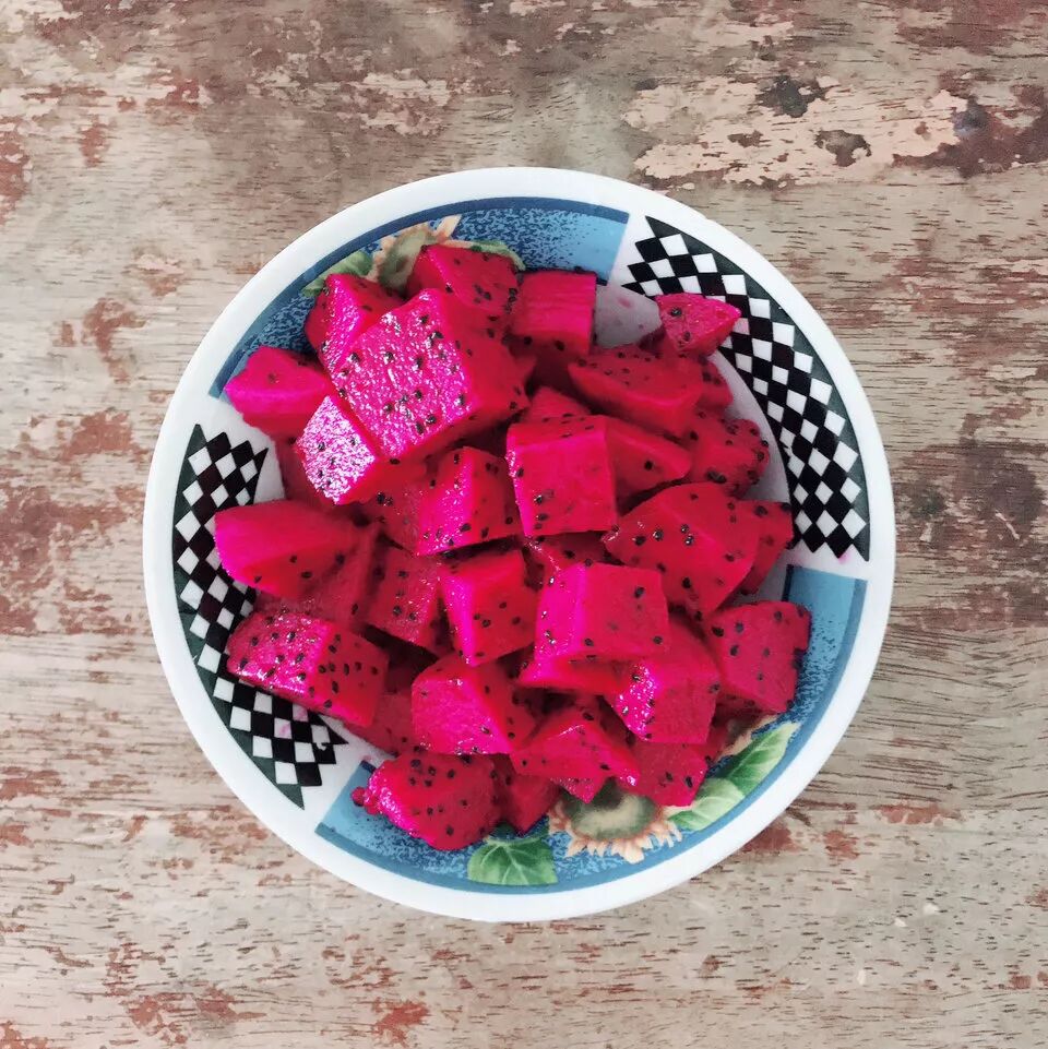 到中午的时候有一点饿,会吃半个火龙果或一个橙子