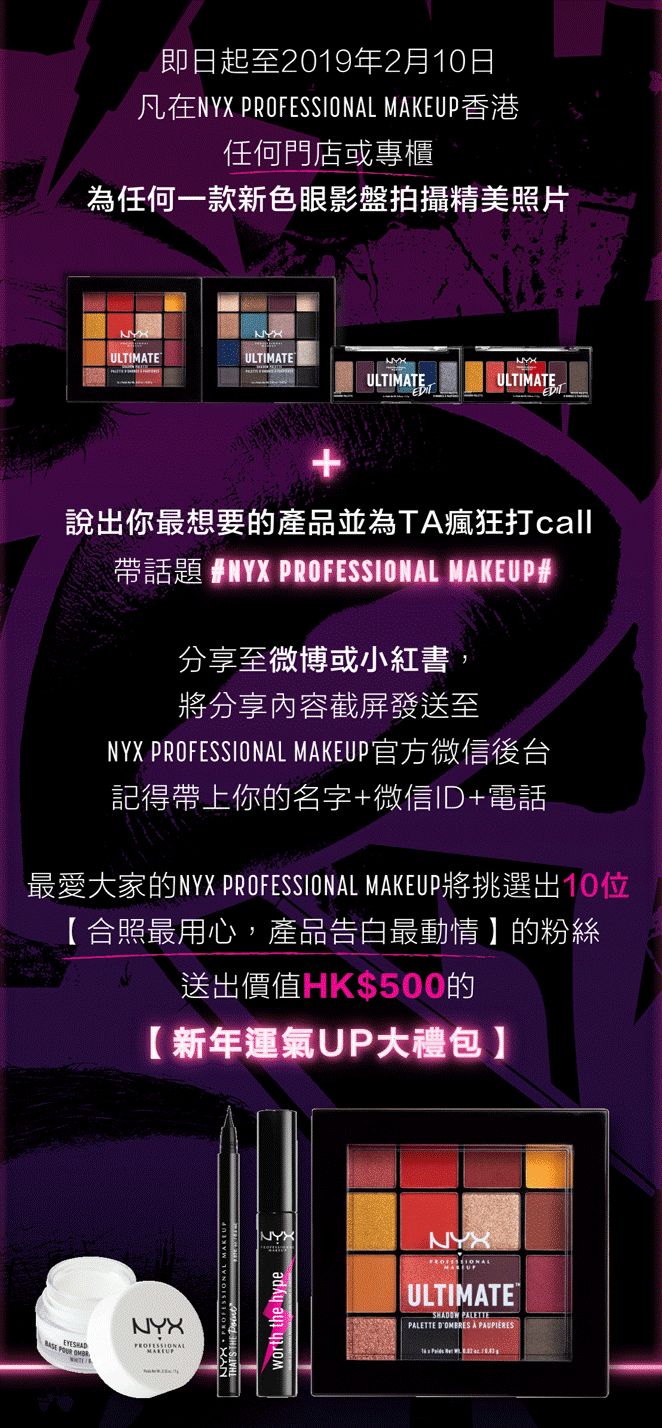 2)参与方式:在微博或小红书平台,带话题#NYXPROFESSIONALMAKEUP#,发布在NYXPROFESSIONALMAKEUP香港任何门店或专柜拍摄的任何一款新色眼影盘的精美照片,写下你最想要的产品并为TA打call,将分享内容截屏发送至NYXPROFESSIONAL MAKEUP官方微信后台(WeChatID: NYXCosmeticsOfficial)并带上你的姓名+微信ID+手机号码。
