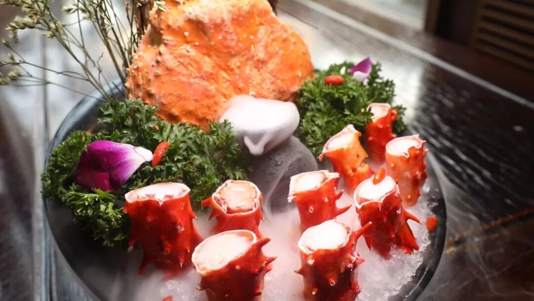 桌子上摆放着四个玻璃瓶,里面装的是火锅汤底,而不是饮料,生铁壶泡的七叶参茶才是免费提供的茶水。除此以外,美味的面包豆腐和无老鸭血可以无限量添加,这个鸭血真的绝了,无论涮多久都是又嫩又滑;面包豆腐是总编大人的最爱,满口浓浓香香的豆腐味!俄罗斯帝王蟹是我的,友情提醒不蘸料更好吃哦。