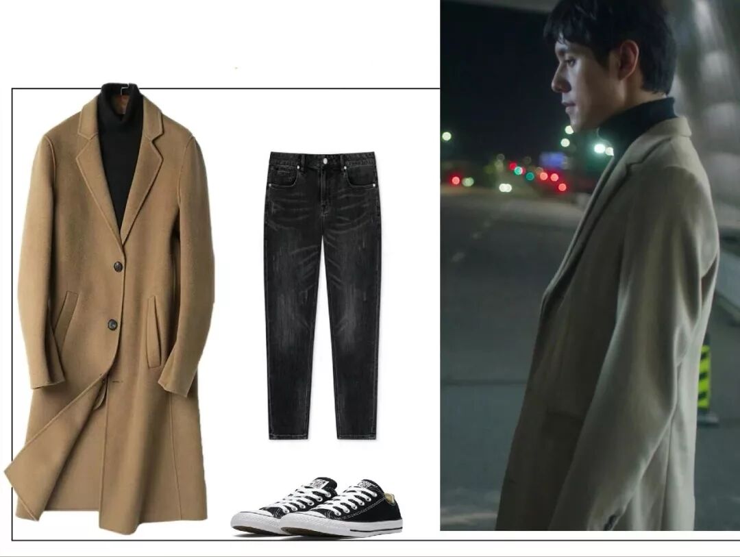卡其色/棕色风衣搭配牛仔裤,内搭一件高领毛衣,一双帆布鞋休闲又好看!