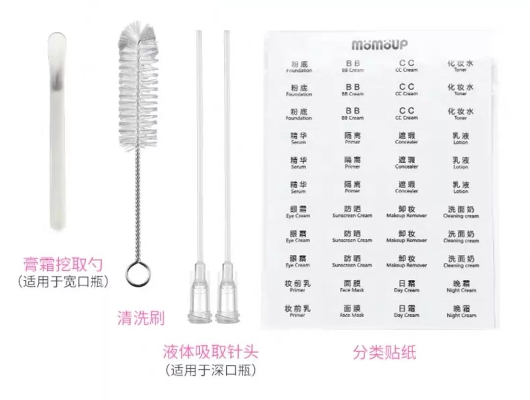 淘宝上的分装瓶种类有很多,很多小的瓶瓶管罐罐并不是很好看,但是这个momoup是我觉得hin好玩,功能还挺全的,质量也不错。用的时候把化妆品装进针管里往外推就行。