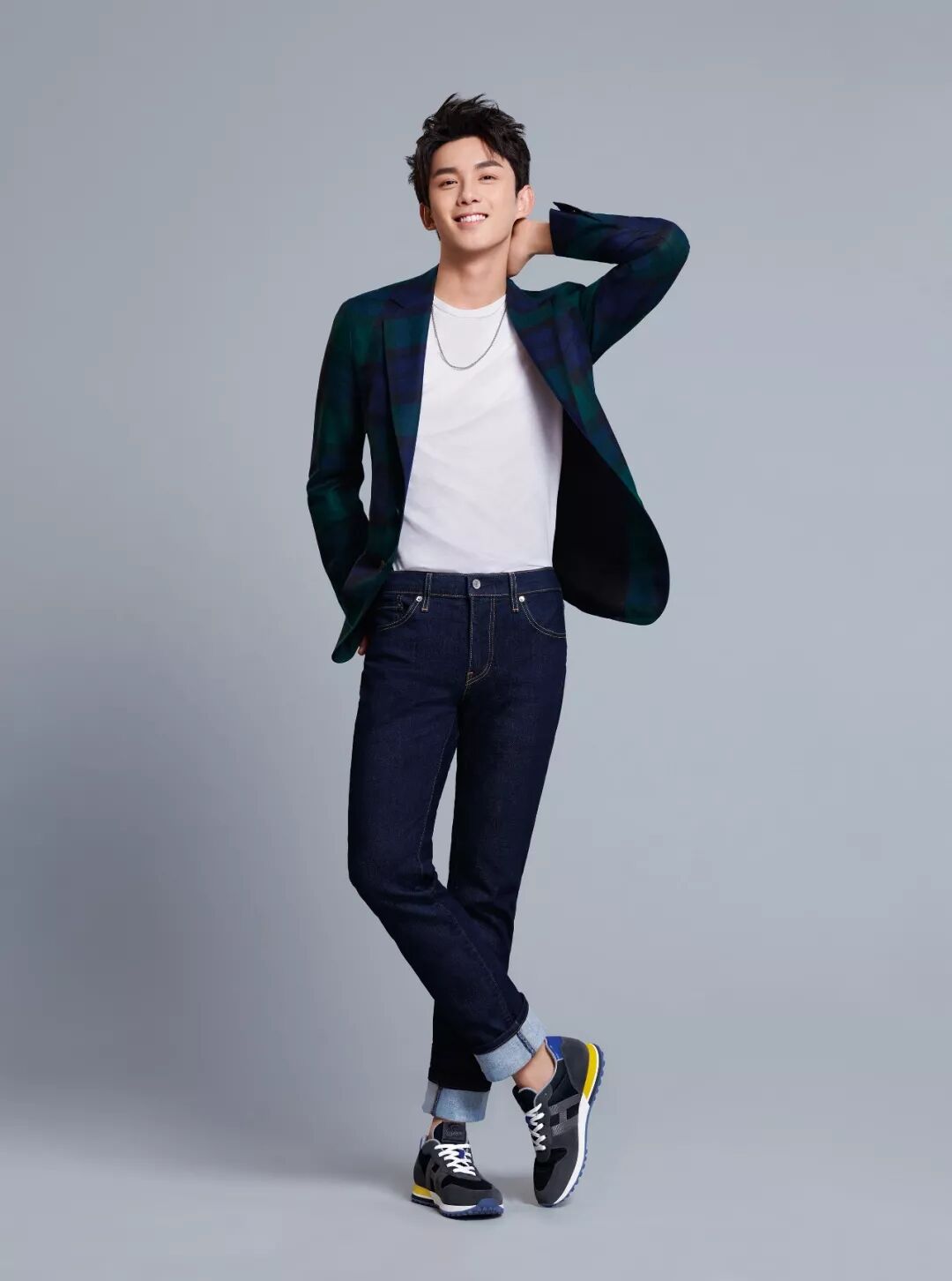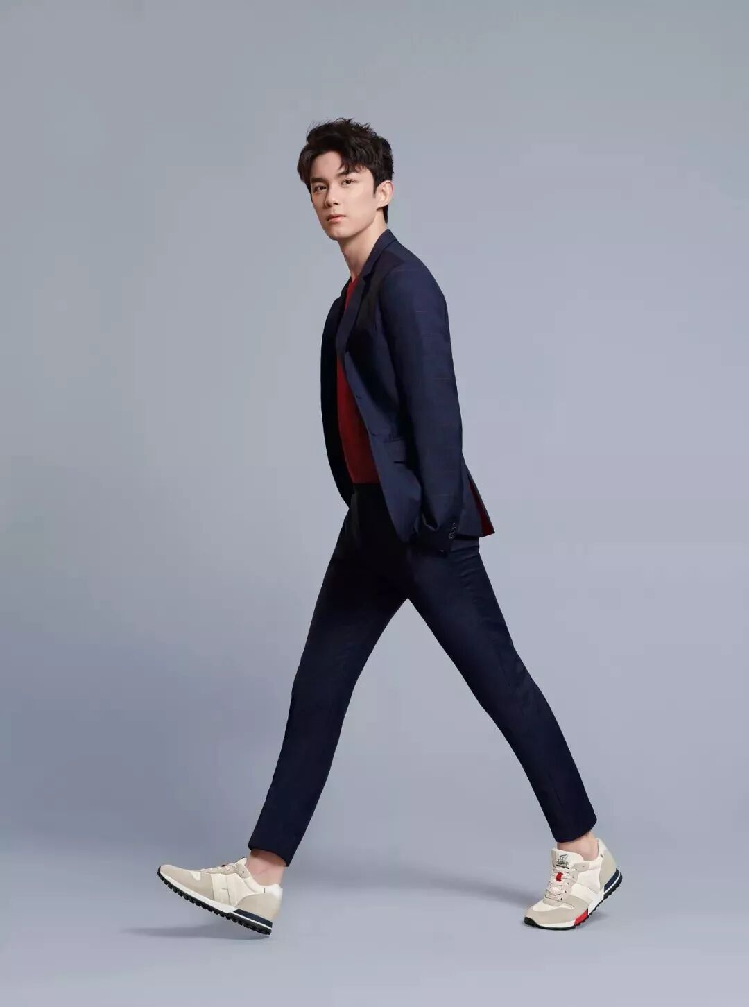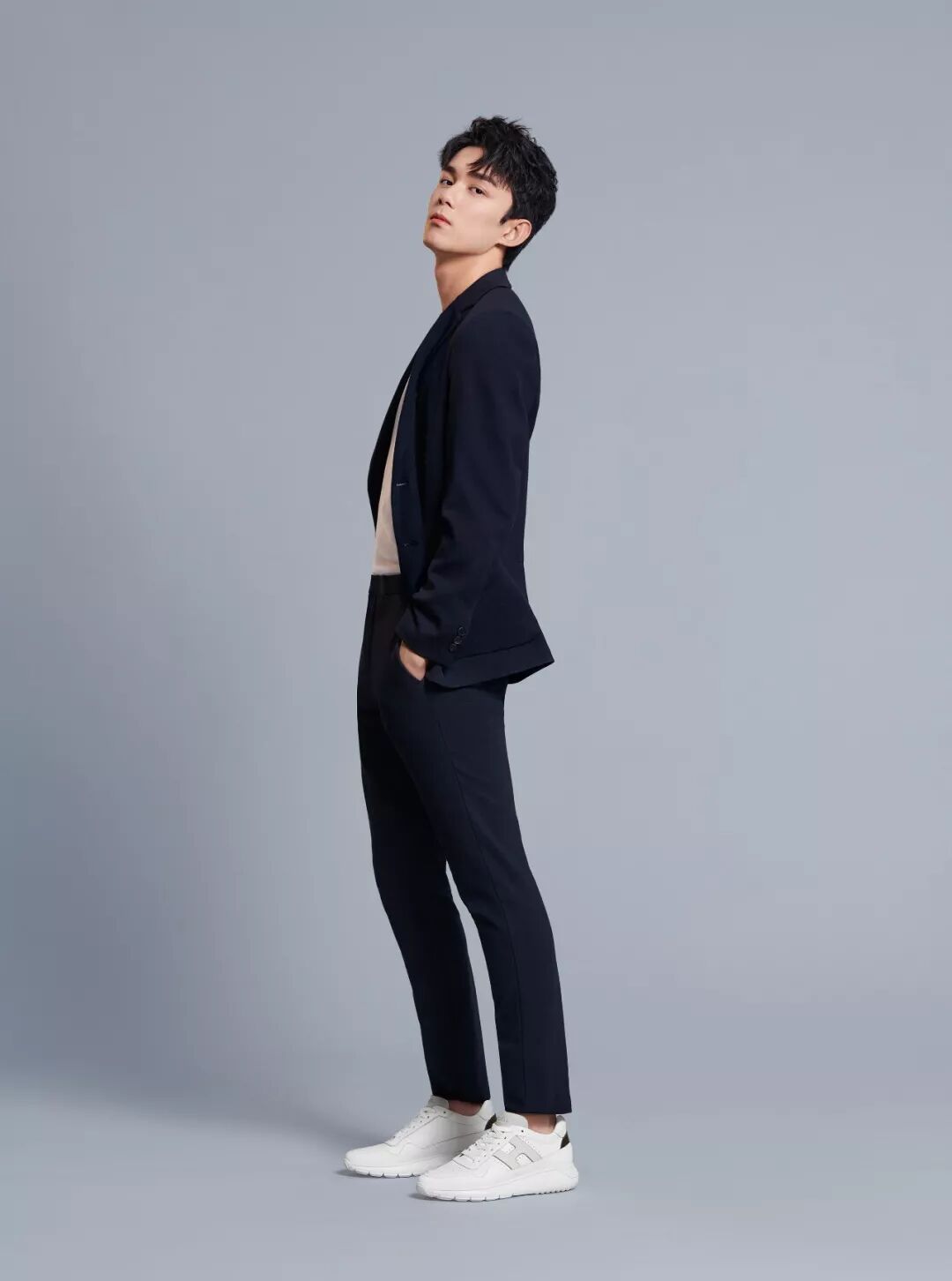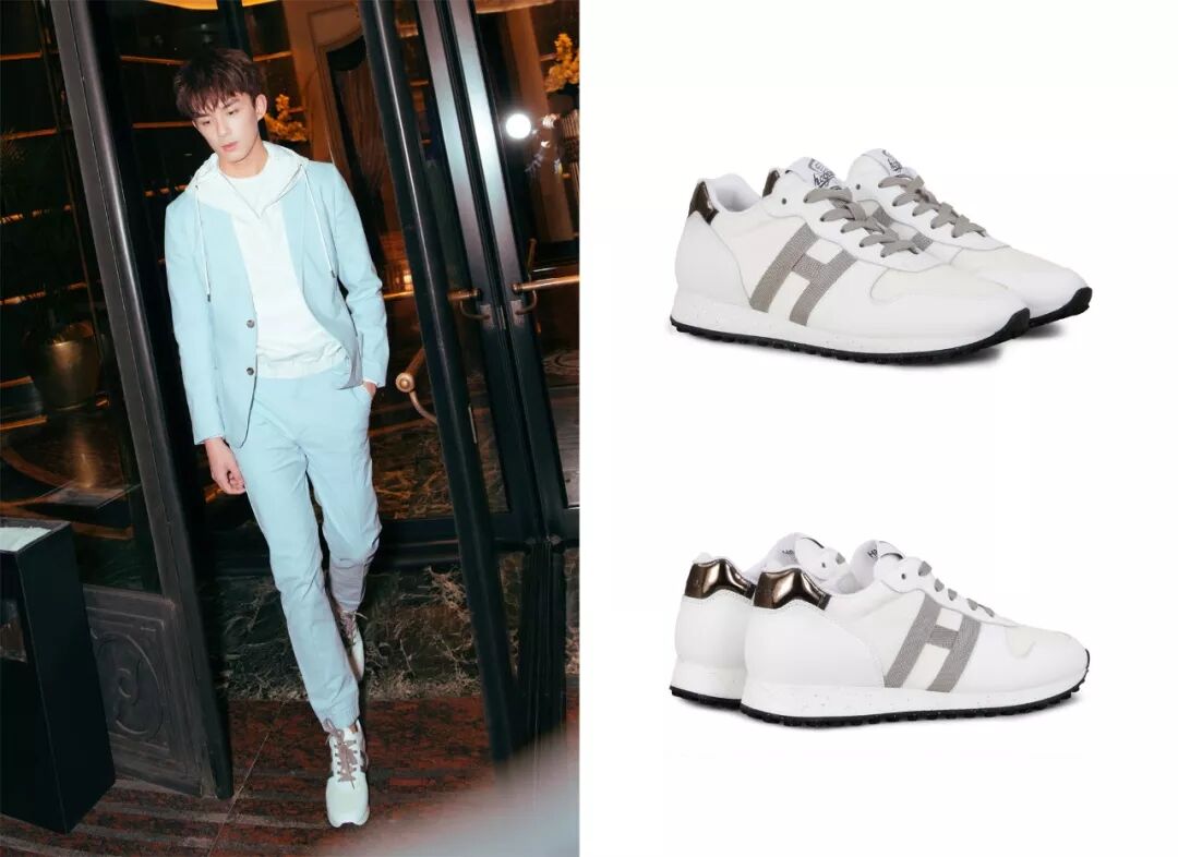 在 HOGAN 晚宴上,吴磊就用一双“白+灰"的 H383 系列复古跑鞋混搭了一身蓝色西装搭配,舒适之余,更添清爽。