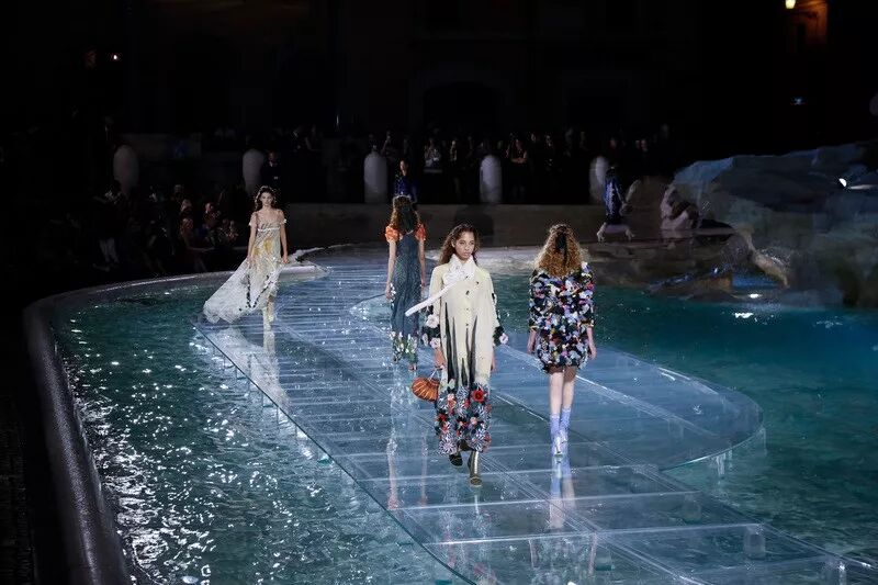2014年,也是 Fendi 成立90周年时,有机玻璃覆盖着的特雷维喷泉成为秀场,模特们行走在“水面”的景象可谓是十分壮观。