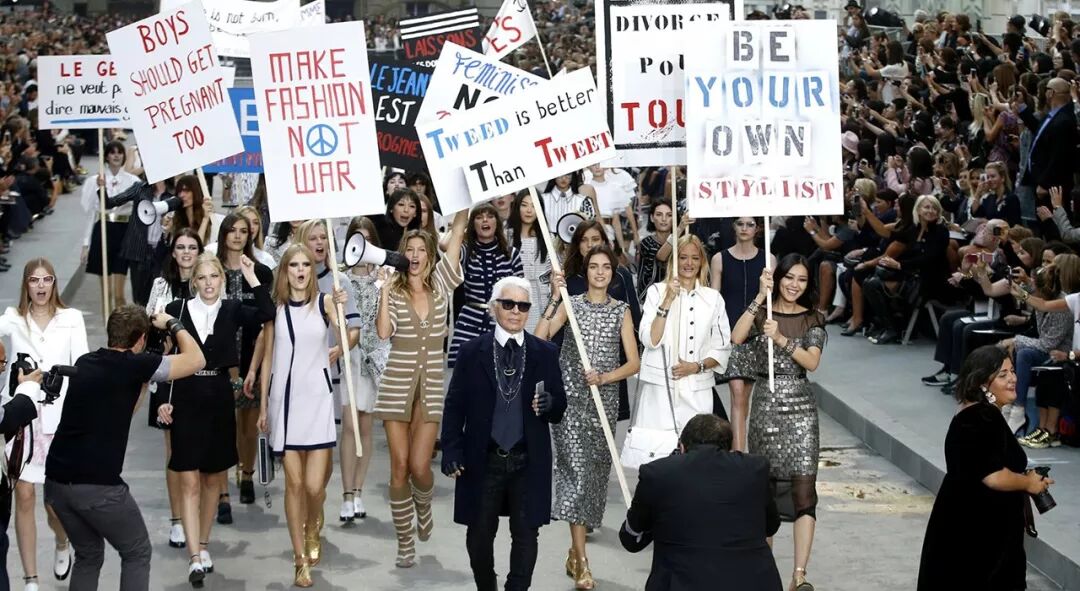还是在5年前,就已经在秀场上让模特举起 “Boys Should Get Pregnant Too” 的标语牌。这都足以证明 Karl Lagerfeld 在整个行业里的领跑姿态。