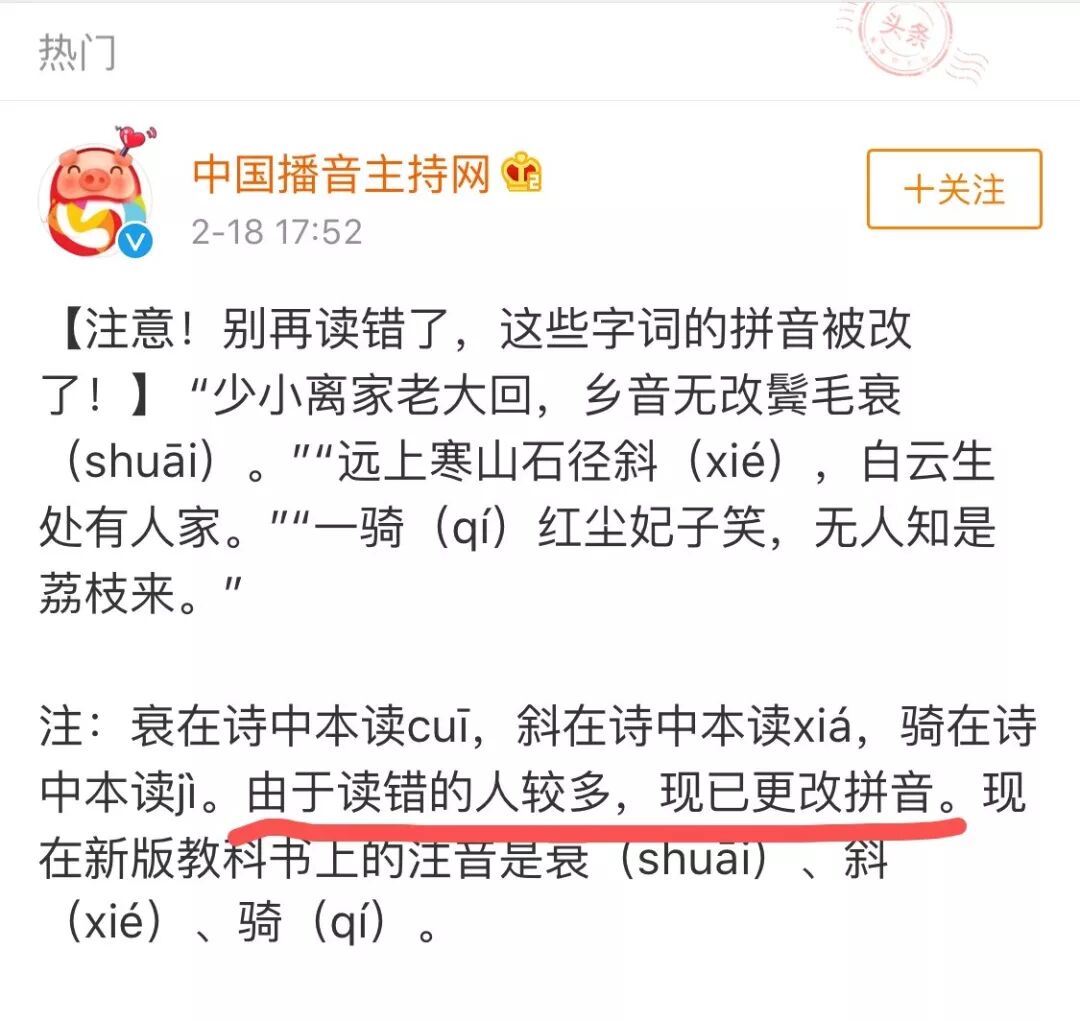 这两年古诗词大会和成语大会之类的综艺风行,不少人爱看。虽然更多是被游戏技艺的部分吸引,多少算是叩开了被不加讲解就“全文背诵,全诗背诵”封闭已久的大门。这倒好,教科书上又开始因为念错的人多统一拼音了。