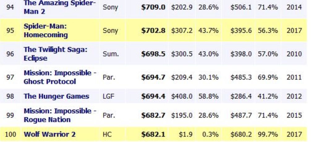 大概只有剧组人员知道拍摄《战狼》到底耗费了多少心血,经历了什么冒险。但毫无疑问,吴京的爱国很成功。美国权威票房统计网站box office mojo上,《战狼2》打破了好莱坞独霸的垄断神话——