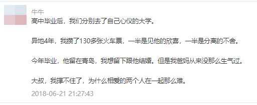 - 01 去年6月开始,有个叫牛牛的姑娘,每天都会在我的文章下方留言。 她和男朋友是异地恋,好不容易毕业可以在一起了,却受到家里的重重阻挠。 21日,她最后一次给我留言,说撑不住了。 2018年6