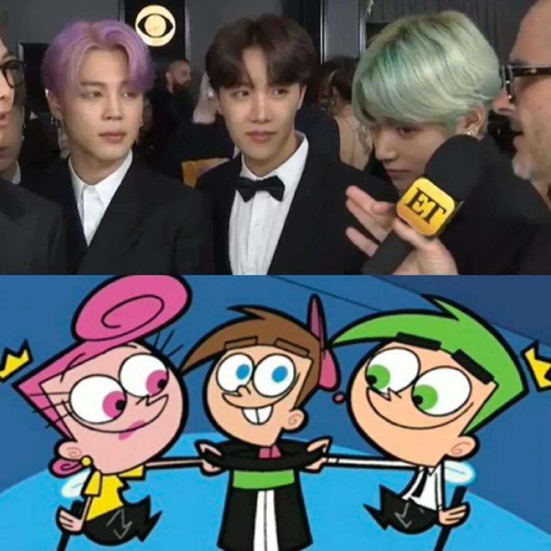 第一次入围的 BTS 也没有幸免,因为发色过于缤纷而被形容 Cosplay 了动画片《Fairly Odd》(反斗家族),不过也算是很可爱了。