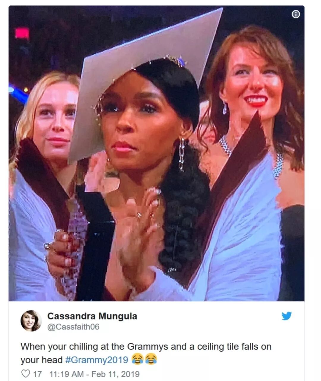 给出的故事情节是——当你在家放松观看格莱美时,天花板掉落正好砸中头。