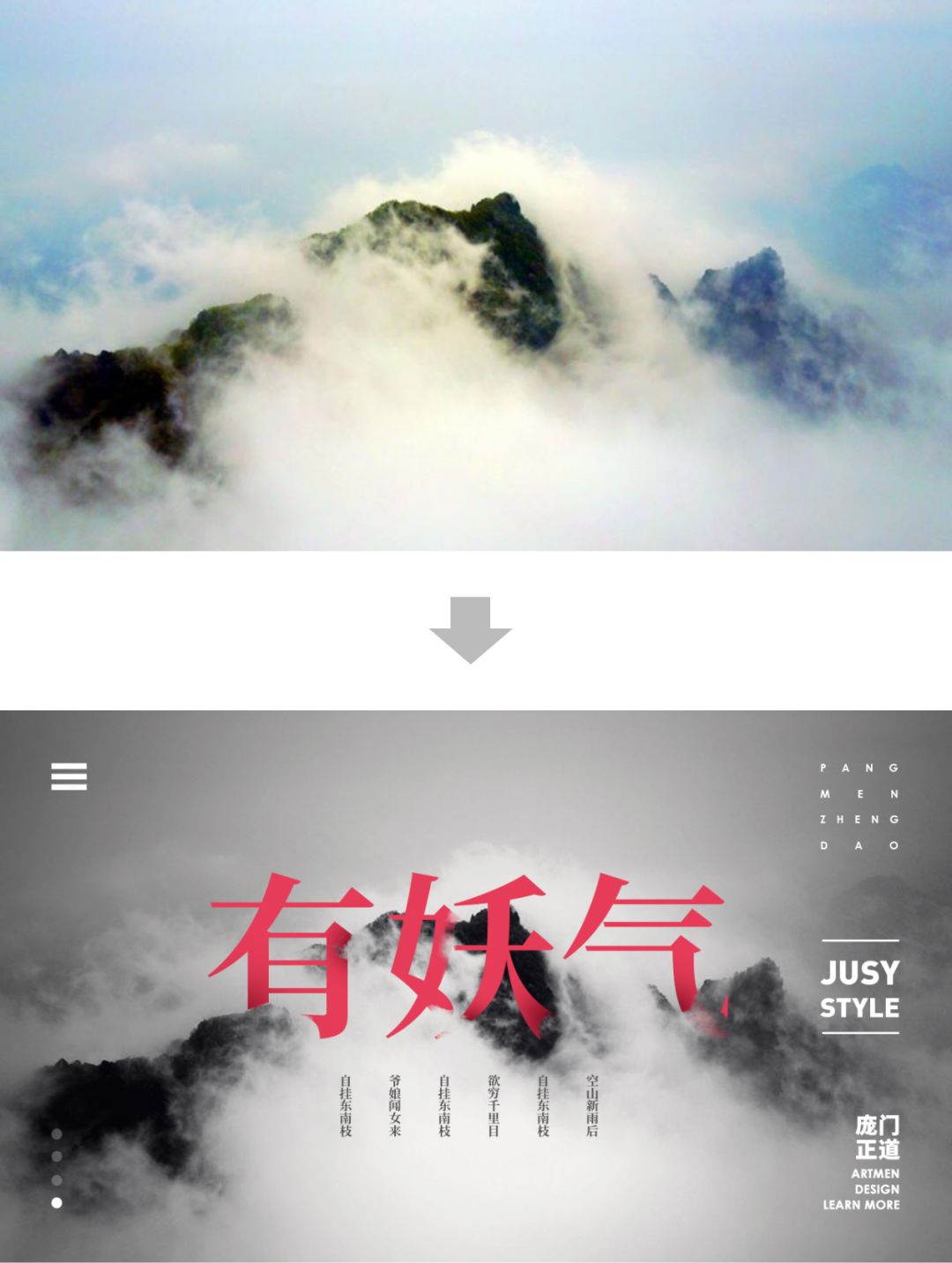 这位同学的选图、排版方式、以及字体风格都非常匹配,所以整体风格看起来比较舒服,第一张图的灰色稍显沉闷。