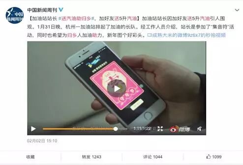 2. 话题刷脸:从网友花式集卡方式及各种集卡攻略爆出,到大妈用抖音神曲演绎广场舞、#打开airdrop有惊喜#等等话题炒作,抖音产出大量表情包,话题不断。其中不乏网友自发产出的话题。以加油站站长#送汽油助归乡#的话题为例,杭州某加油站站长为集齐音符,自发发起“加抖音好友送五斤汽油”的暖心活动,不仅得到了网友的200w+的暖心讨论,阅读量突破 1.1亿,更得到了人民日报、济南晚报、新浪、网易等等数百家媒体的自来水报道。