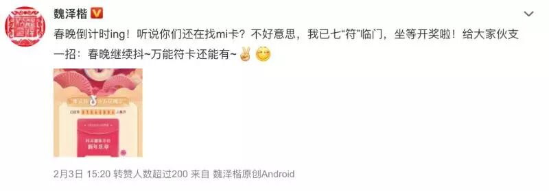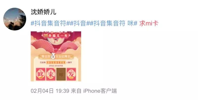 3. 事件引爆:全民集卡热潮,在mi卡的饥饿营销下达到高潮——7个音符中的mi卡非常稀缺,很多小伙伴万事俱备只欠音符mi了。这熟悉的套路,让人不仅想起被“敬业福”支配的恐惧,也因此引发了全民求mi卡的狂欢。
