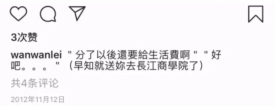 她早年在社交账号中是秀过恩爱的,还直言过“分手还要给生活费”,这显然是两个人情到浓时的某种调侃,调侃的是财富男性甩掉女朋友的通常方式……