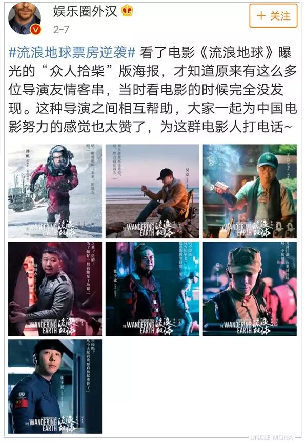 这是流浪地球剧组全体人员,对一个人在表达感谢,也是这部电影的演员之一,吴京。