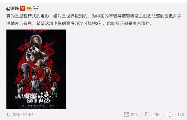 宁浩、郭帆、韩寒三个导演,在互为春节档竞争对手的前提下,毫不避嫌的为对方电影转发宣传,加油喝彩。