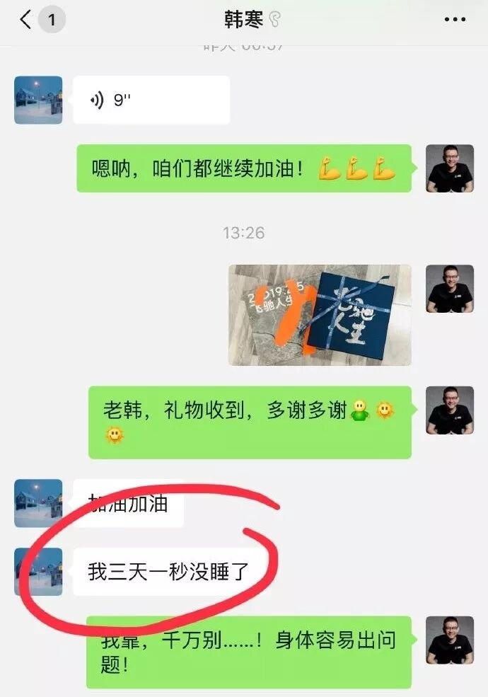 《飞驰人生》的导演韩寒,三天一秒没睡,还在微信里跟他相互打气。