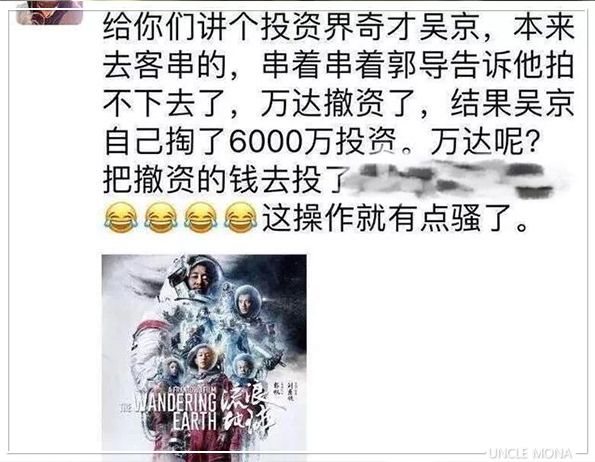 一开始只说是请吴京去客串,结果剧组遭遇投资方中途撤资,没钱了。吴京只好自掏腰包投了6千万。