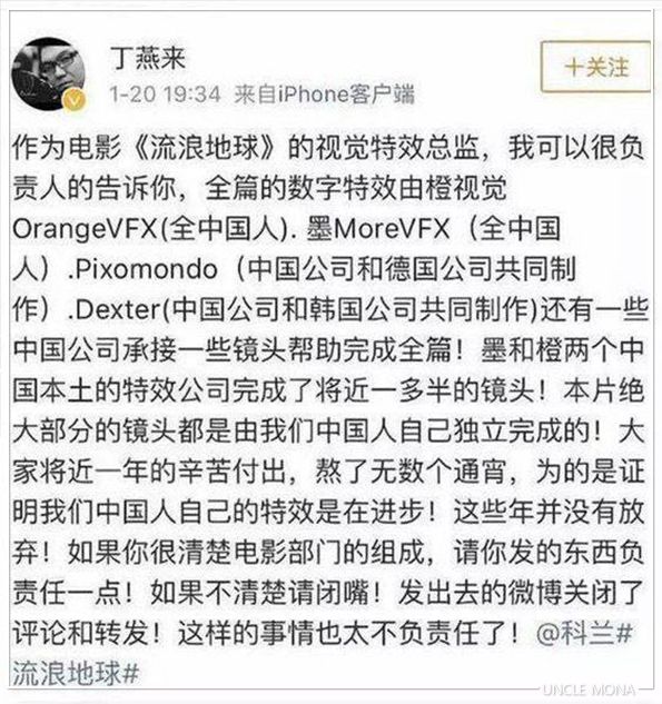 大家将近一年的辛苦付出,熬了无数个通宵,为的是证明我们中国人自己的特效是在进步!这些年并没有放弃!”