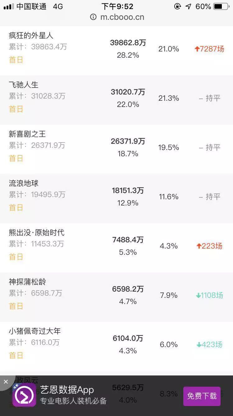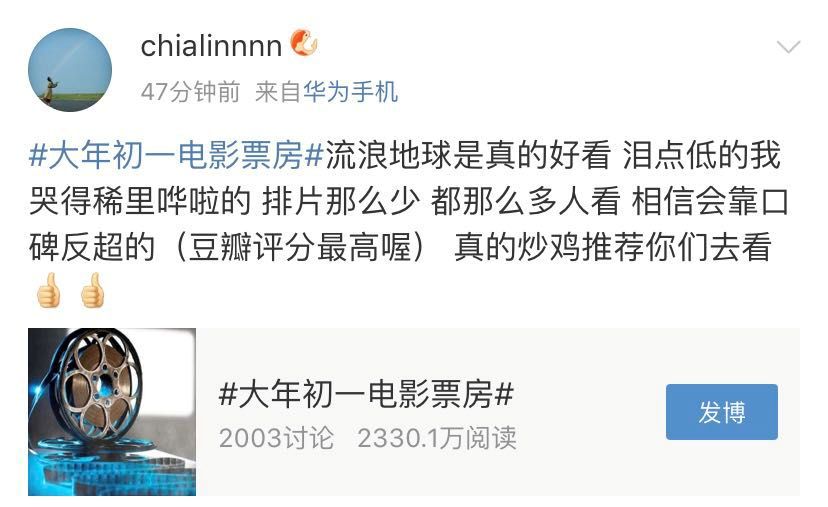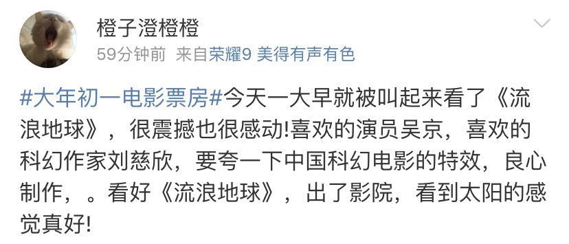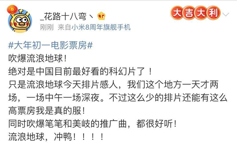 几乎没有任何悬念,黄渤的号召力爆棚,一天4亿,韩寒的飞驰人生,一天3亿,星爷的第一天也2.5亿,没有大牌支撑,没有多少宣传的《流浪地球》,凭借11%的排片量,拿了接近2亿票房!