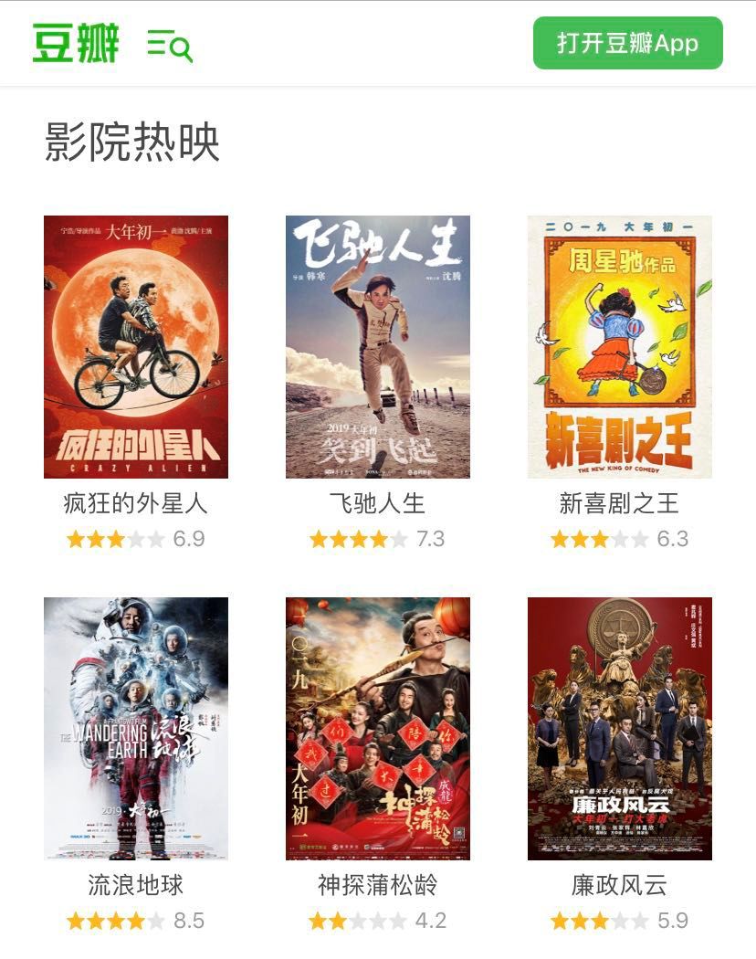 - 昨天0点开始 4大天王开始竞逐春节档期的头炮! 《疯狂外星人》 《飞驰人生》 《新喜剧之王》 《流浪地球》 今天早上我看了一下豆瓣,疯狂,飞驰,分别都是7.5分左右,喜剧6.8分,地球8.4分。按照