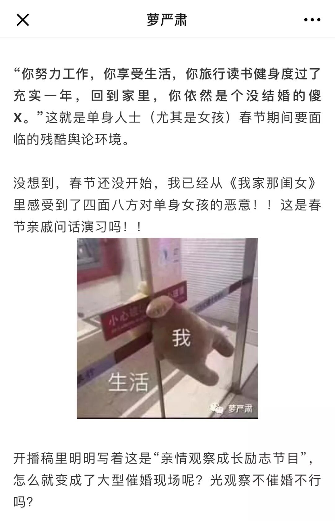 前几天萝贝贝仔仔细细地分析了这个节目对独立女性艰难的处境,催婚带来的恐惧越发的清晰具体。