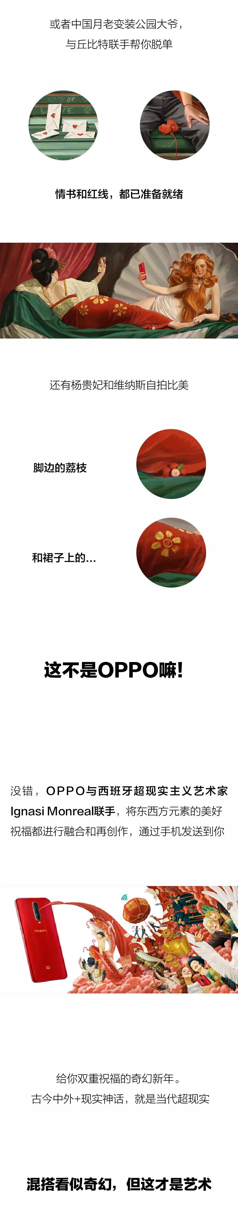 艺术的风格随着时代的需要而不停地改变,但是超现实主义却每隔一段时间就要再复兴一次。它流行了这么久,至今依然是艺术家们热衷的风格。只要脑洞存在,超现实主义就不会停止。马蒂斯希望自己的艺术能像一把抚慰心灵的安乐椅一般,很显然这个愿望超现实主义者们也实现了。超现实艺术不像抽象艺术那样晦涩难懂,也不像某些当代艺术那样简单粗暴,它像一座奇幻的游乐园,人们游玩其中,畅游别人的脑洞,感受所有生活中的元素通过不可思议的方式奇妙搭配。这次与OPPO合作的西班牙艺术家Ignasi Monreal大家可能不是很熟悉,其实这个90后艺术家已经与多个奢侈品牌有合作了,在这次的插画中,他表达了不一样的中西合璧,也将OPPO想送给大家的新年祝福变成了彩蛋,可以尝试找找看~顺便跟大家说一句:新年快乐!