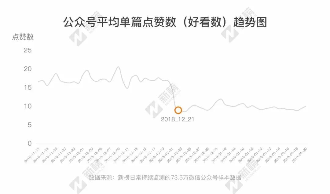 根据新榜基于逾70万微信公号的监测数据显示,以12月21日为分界线,也就是微信更新将公号右下方的「点赞」改为「好看」之后,微信公号的平均单篇内容点赞数(好看数)暴跌一半。