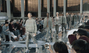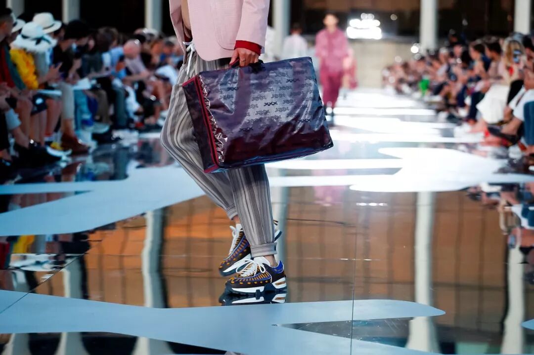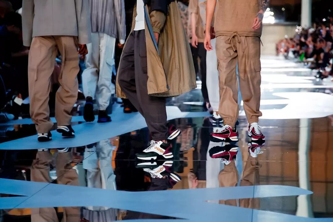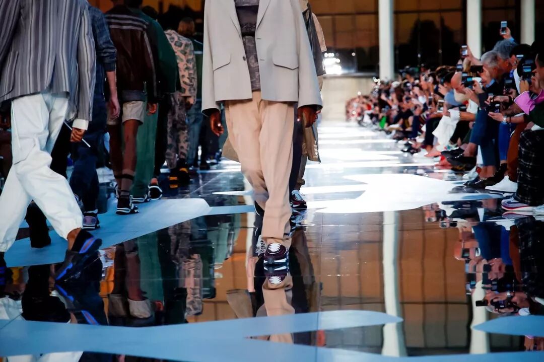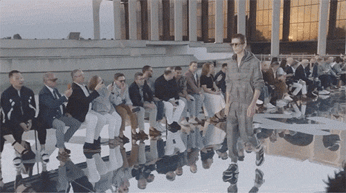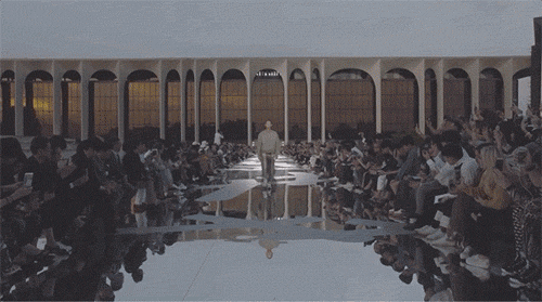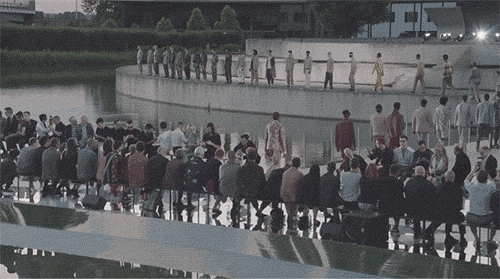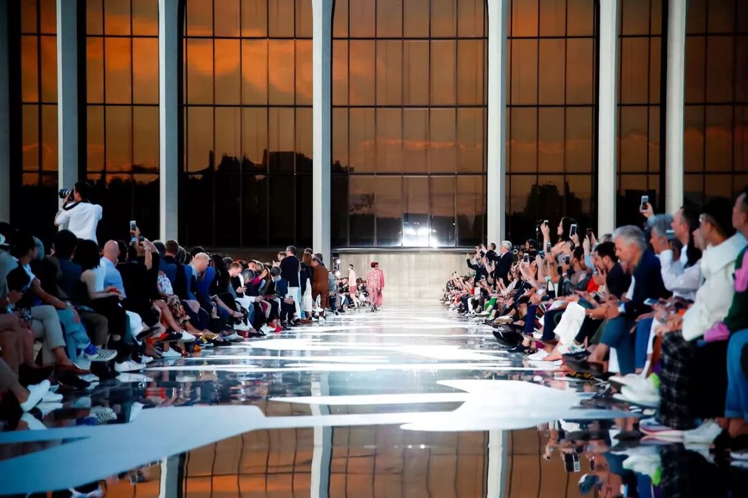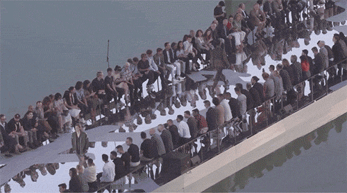 模特们沿着坐落于水池中央的秀场,大步走来,那些赫然醒目的镜面狭长T台恰似悬浮于空中。