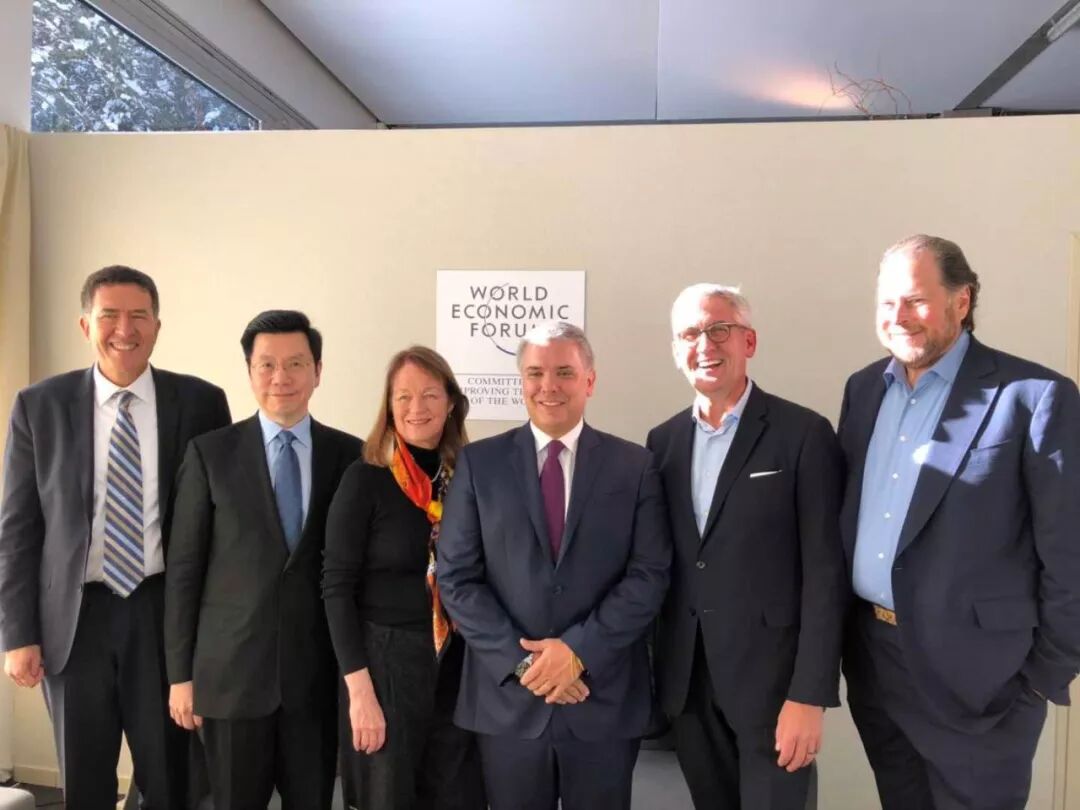 达沃斯“第四次工业革命领袖对话”新闻发布会出席代表合影,从左至右依次为:第四次工业革命中心执行董事Murat Sonmez,、开复老师、帝国理工大学校长Alice Gast教授、哥伦比亚总统Iván Duque Márquez、ABB公司CEO Ulrich Spiesshofer、Salesforce公司CEO Marc Benioff