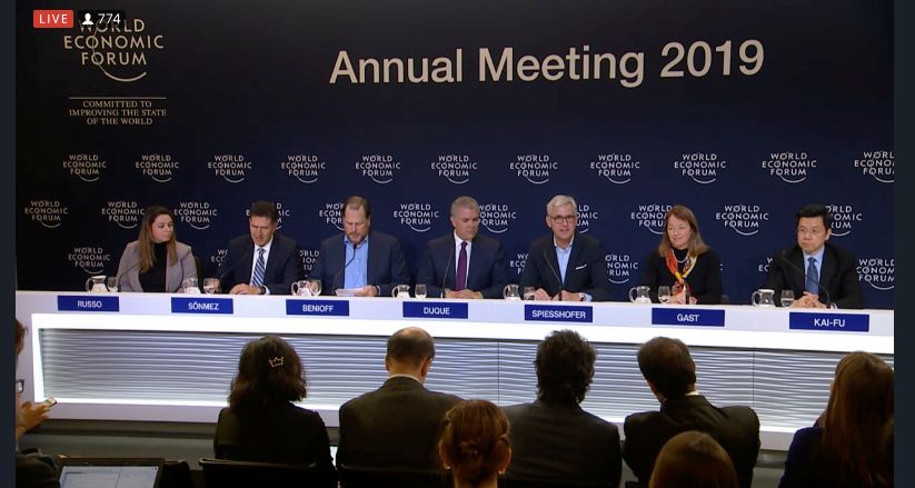 在达沃斯“第四次工业革命领袖对话”新闻发布会现场,开复老师宣布就任“AI Council人工智能委员会”联席主席一职,哥伦比亚总统Iván Duque Márquez、第四次工业革命中心执行董事Murat Sonmez、帝国理工大学校长Alice Gast教授、ABB公司CEO Ulrich Spiesshofer、Salesforce公司CEO Marc Benioff均作为代表出席发布会。