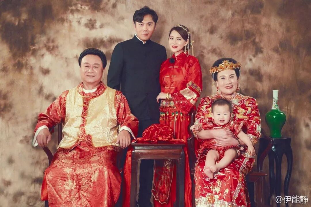 伊能静与秦昊的全家福,穿上了中国传统的红色喜服,娇俏又喜庆。