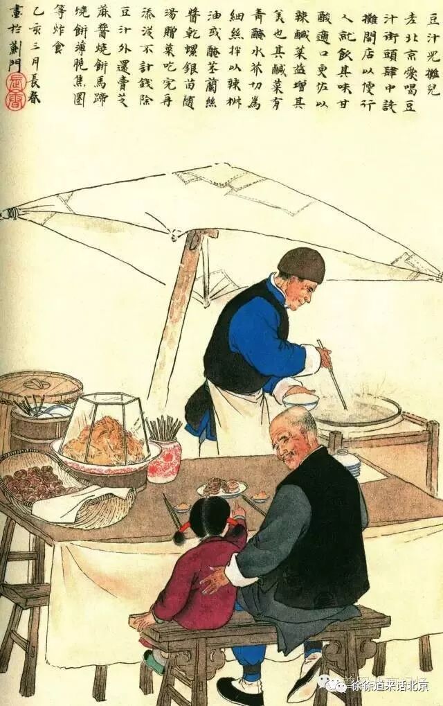 其实啊,在民间,豆汁儿的主顾更不分贵贱,好像凡是穿戴体面的人在庙会上吃“灌肠”或“羊霜肠”,往往会被人耻笑,唯独喝豆汁儿则不足为耻。民间卖熟豆汁儿有两种形式:一是走街串巷的豆汁儿挑子,吆唤“开了锅的豆汁儿粥!”买的呢,多是以锅、碗端回家去喝;另一种形式是在庙会集市上摆个豆汁儿摊,设丈余长案,前摆长凳。案上放2—4个大玻璃罩子,大玻璃罩内放大果盘,盛着酱黄瓜、八宝菜、酱萝卜、水疙瘩丝等。春季备有爆腌酱苤蓝,冬天备有五香萝卜干丁。对购买细酱菜的顾客供应辣椒油。并代卖芝麻酱烧饼、炸焦圈儿等食品。这显得是特别的周到。那到了解放前,专有以卖豆汁为生意的小摊贩,或挑担走街串巷,或在集市上摆摊,前沿儿围着块蓝布,上边有白布做的字号商标,叫卖时只吆喝:“豆汁儿,开锅!”不过,这种遗风已荡然无存,今天的年轻人是感受不到这种气氛了……
