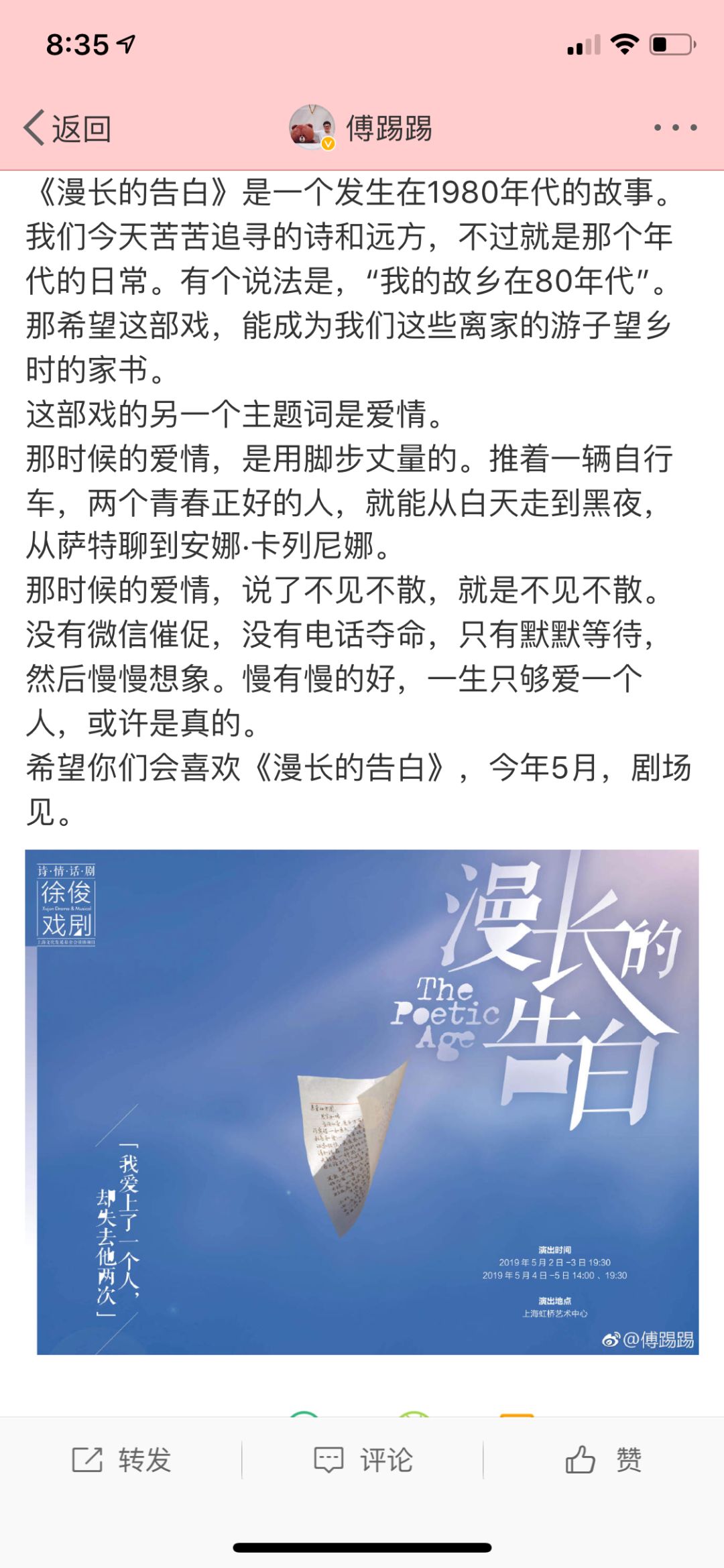 过几天我会在微博@傅踢踢上抽奖。奖品是从主创福利里匀出的2张《漫长的告白》首演戏票。(是的票卖太好了,主创福利一共就4张,别嫌少啊)