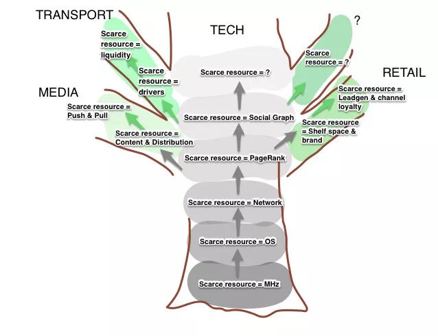 - 科技产业如同一棵树那样,按照两种方式生长:一是伸展到邻近行业,随着入侵而改变了稀缺资源的特性;二是反复递归地自我发展和改变(每一代技术都会演进出最新的稀缺资源);