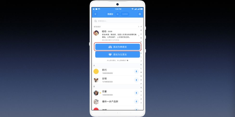 7.在加好友时,你可以把对方列到生朋友或者熟朋友栏里,他们的消息会分开集中显示,让你更好处理社交关系,也能有效避免无用信息的干扰。我们还设计了避免尴尬的扫码界面,点击扫码会同时出现扫描界面以及自己的二维码,让谁扫谁不再成为问题。