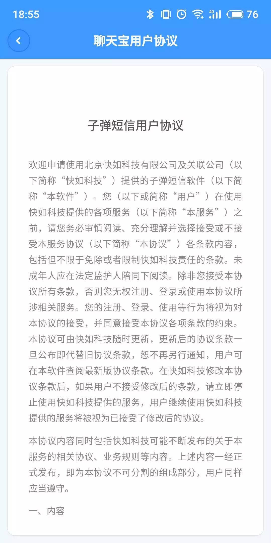 当然,第一波就是子弹短信的用户,你看看聊天宝的用户协议都还没有来得及修改就知道,还用着子弹短信的用户协议。