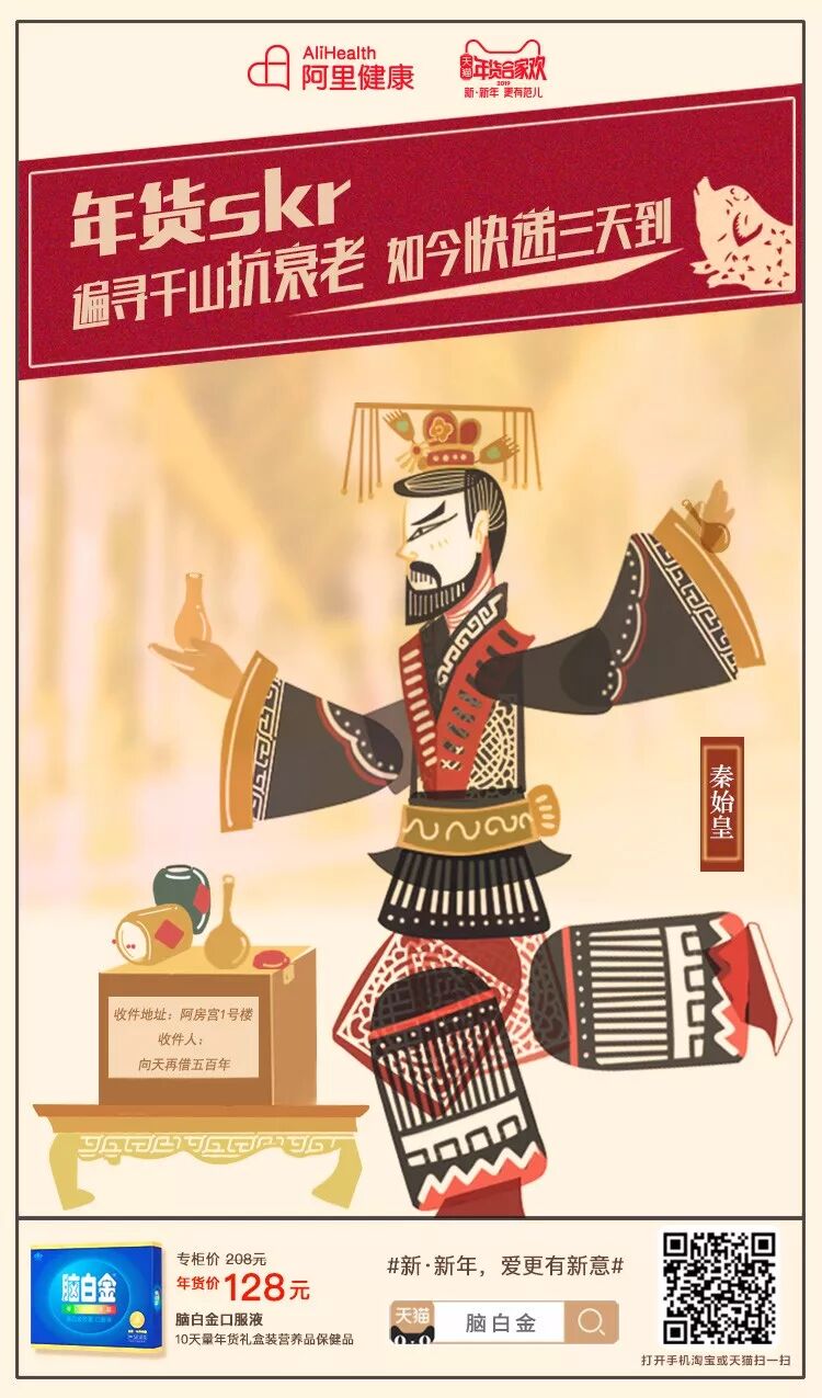 每年都少不了的年货巨头保养品——脑白金助力年轻人表达孝心。