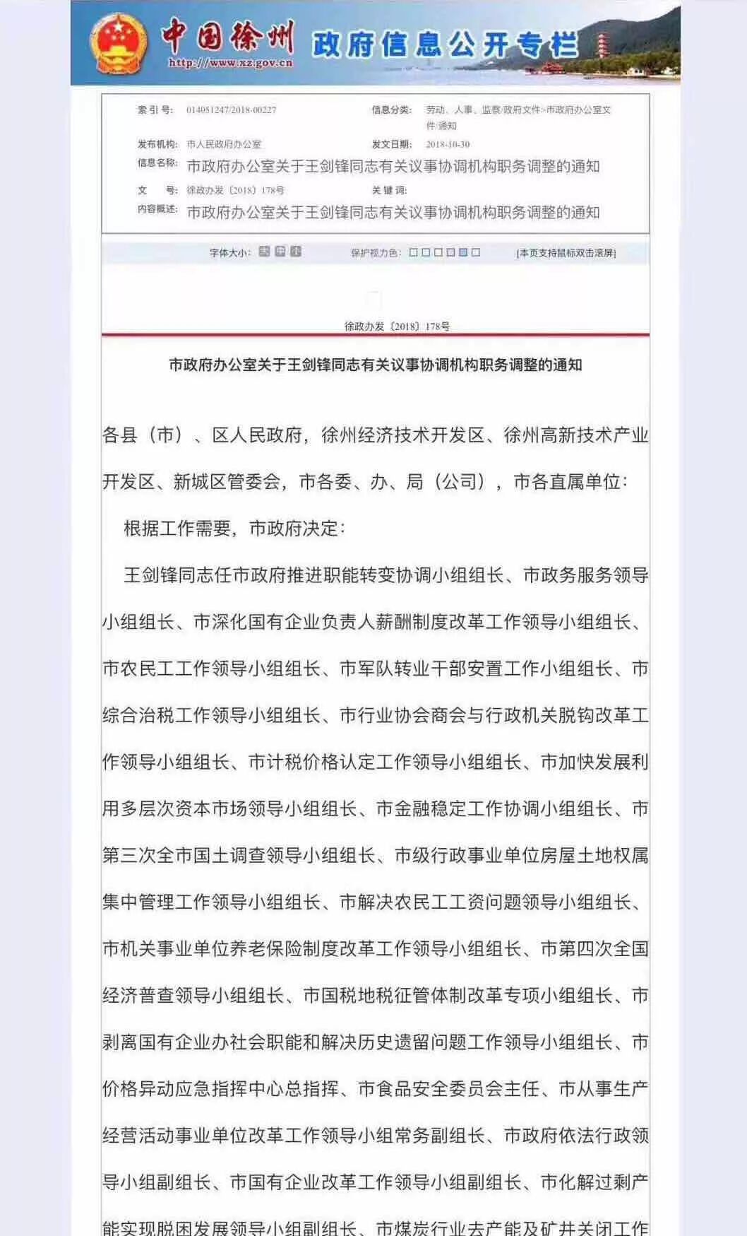 12日,徐州市人民政府新闻办公室官方回应称,王剑锋任职的机构都是为“提高协调效率,加快工作落实进度”而成立的议事协调机构。这些机构都是临时性的,不增加编制和经费,不涉及干部职级,在达到期限或预定条件时即予以撤销。