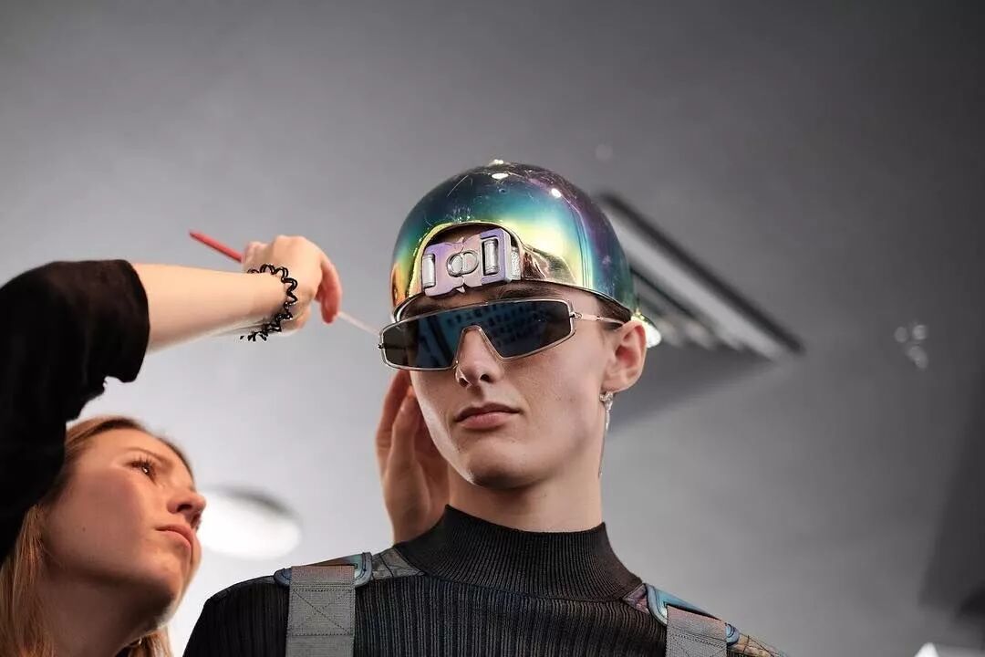 反光面料、金属元素模拟着机械化的外观。Ambush的主理人 Yoon Ahn 为 Dior 男士们打造了以螺母、链条为形象,模仿科幻片中机器人元素的配饰。
