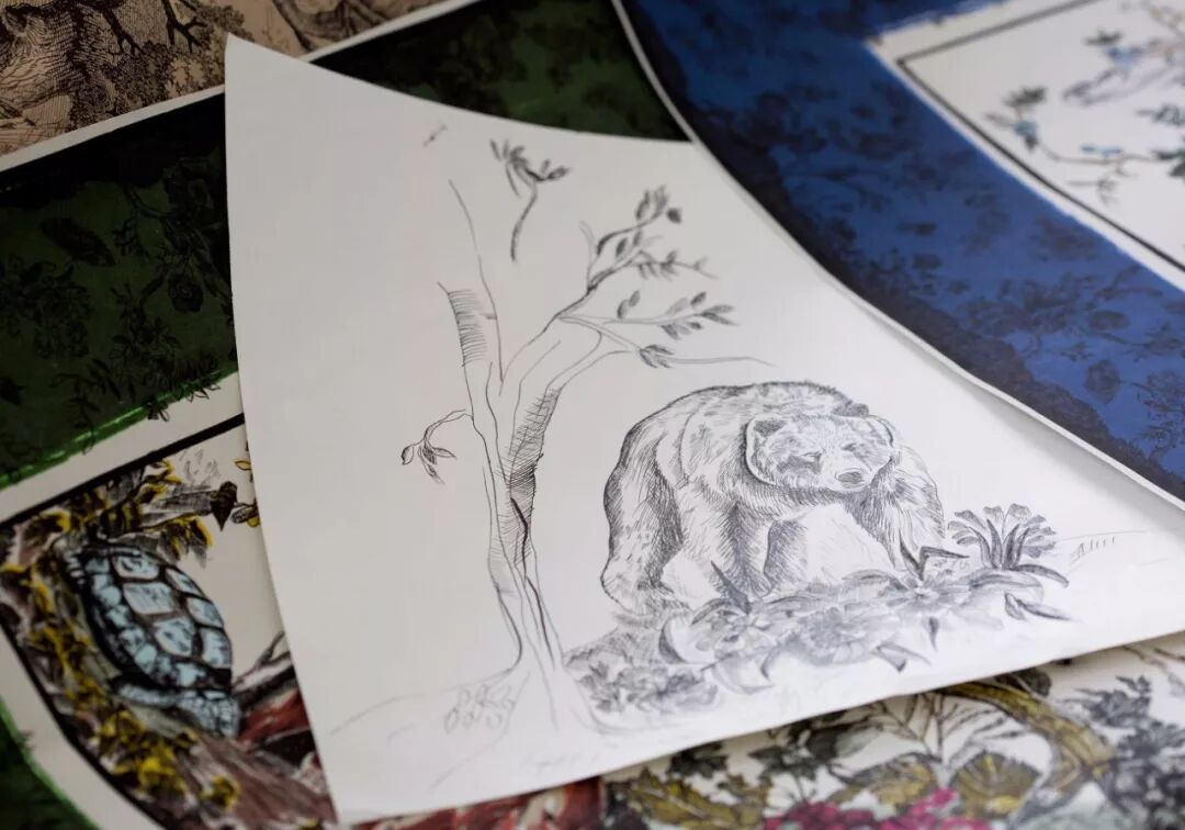 成衣上的手绘图案,就运用了品牌经典的茹伊印花 (Toile de Jouy)。