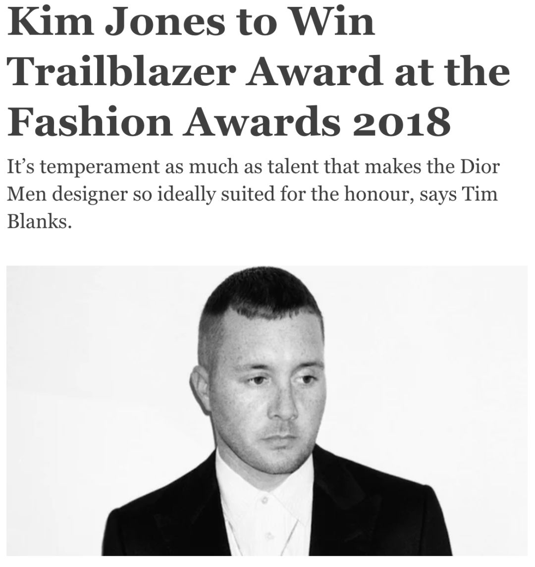 就在去年底,英国时装协会(The British Fashion Council)就颁发给 Kim Jones 一个全新设立的奖项——
